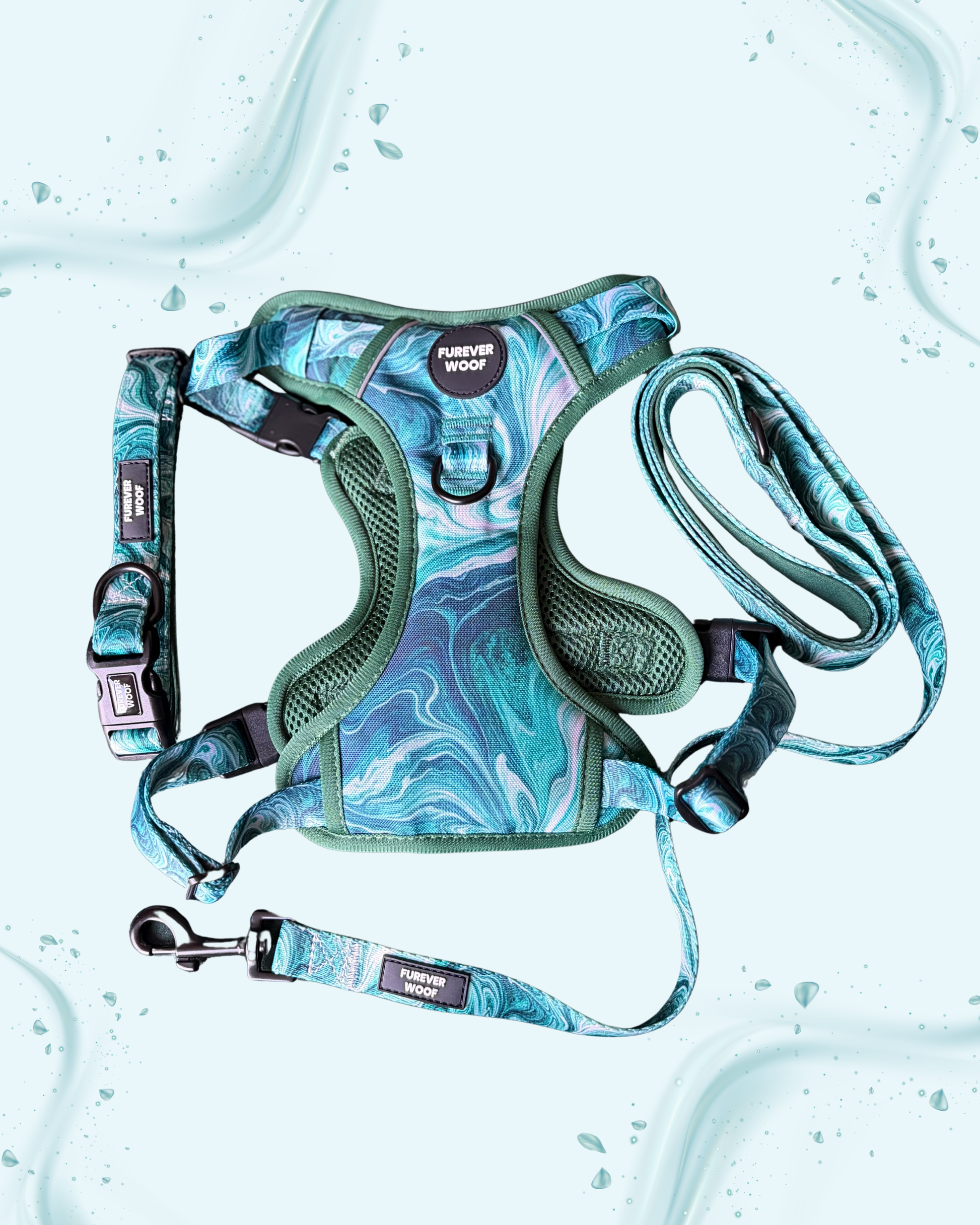 This matching Emerald Swirl harness, collar, and lead set is as unique and lively as your pupâperfect for everything from trail adventures to park playdates. Designed for comfort, durability, and effortless style, each piece features an adjustable fit and lightweight feel to keep your dog secure without sacrificing freedom or flair. Quick-drying and sturdy, itâs made for all the zoomies.